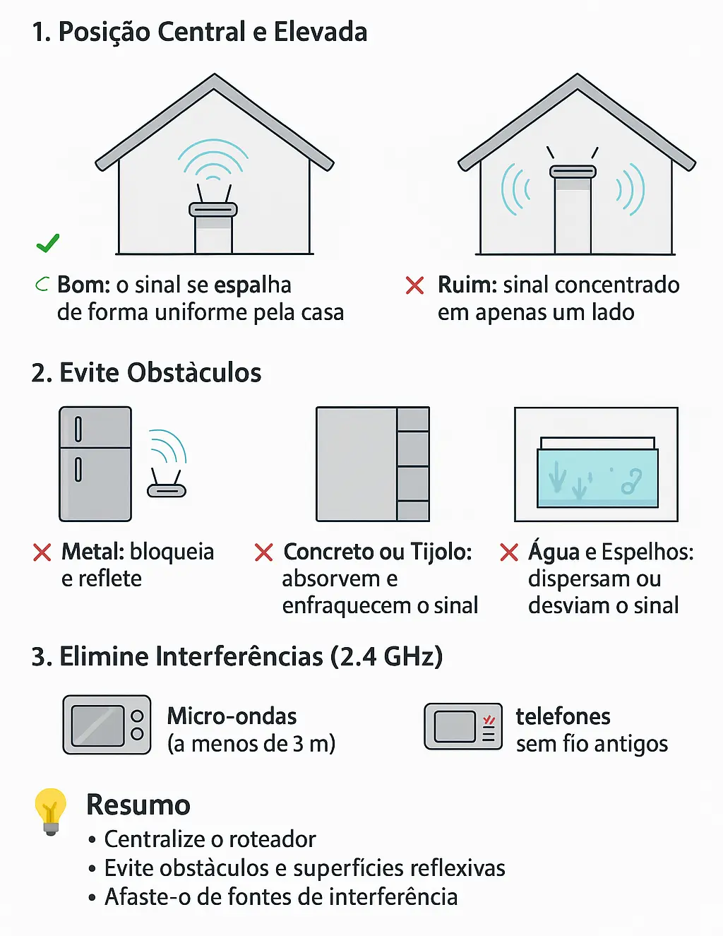 Resumo: pense no seu roteador como uma lâmpada: ele deve estar no centro e em posição alta para “iluminar” todo o ambiente.